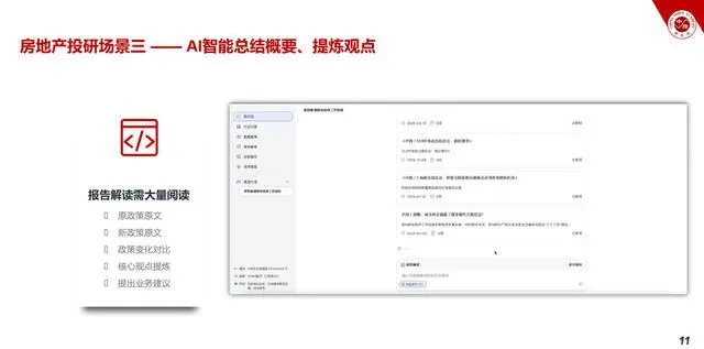 第三,解读大量报告也是地产行业客户的痛点。比如两会后的《政府工作报告》及中指报告,内容很长。用户输入想了解两会《政府工作报告》核心内容及中指观点的问题,系统会弹出相关内容,点击一键解读即可获取报告核心,还能在右侧与DeepSeek交互提问,该功能已落地。