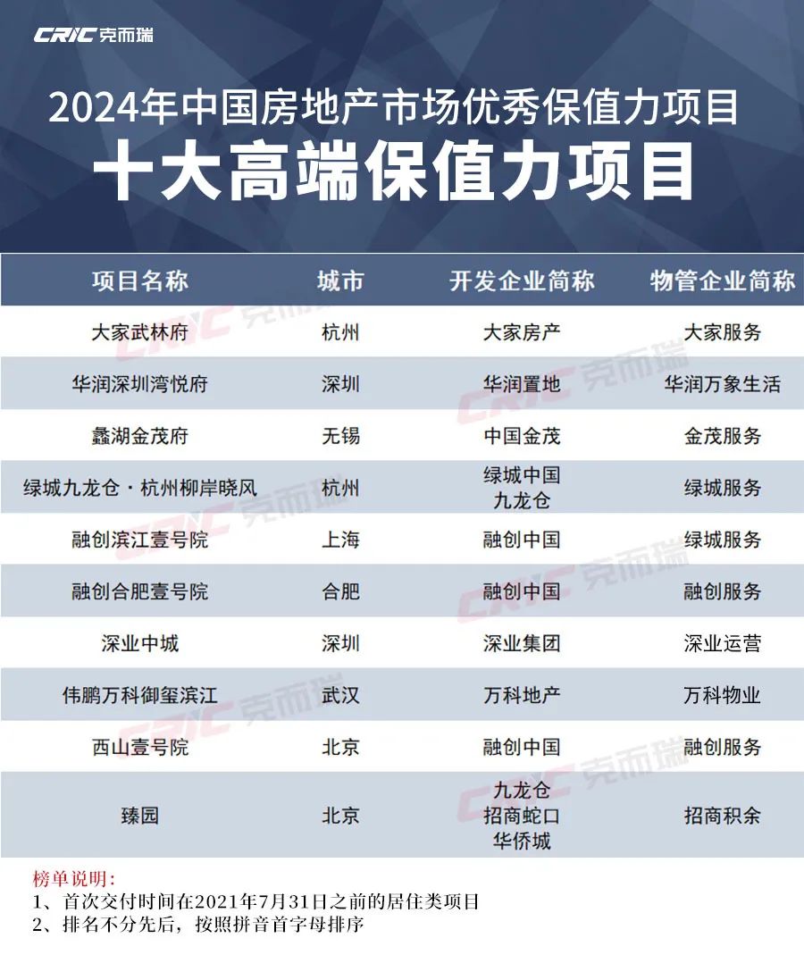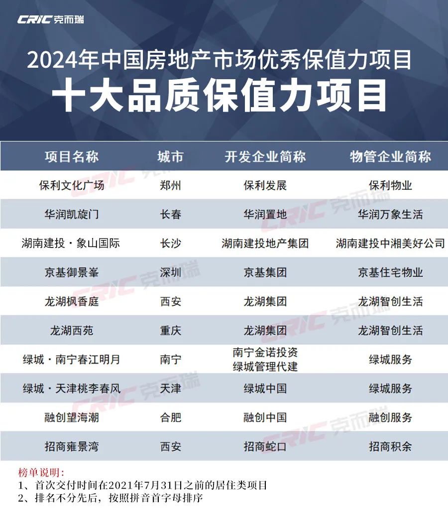 在当前房地产市场整体去化速度放缓的背景下,企业要想穿越周期,关键在于打造能够适应市场变化、满足消费者需求的高品质产品、提供贴心完善的服务。在此背景下,CRIC保值力研究工作组启动了“保值力”测评工作,通过对已入住运营的项目进行保值力综合测评,挖掘并表彰那些在长时间尺度上表现稳健的项目,为整个房地产行业树立标杆,推动行业向更高质量发展转型。